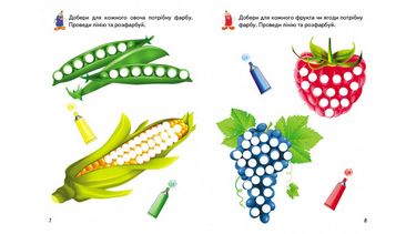 Діти залучаються до гри, де кожен малюк — видатний художник. Запропонуйте їм розфарбувати ягоди для бабусиного варення, а також овочі й фрукти на малюнках, і побачите самі, який чудовий буде результат.