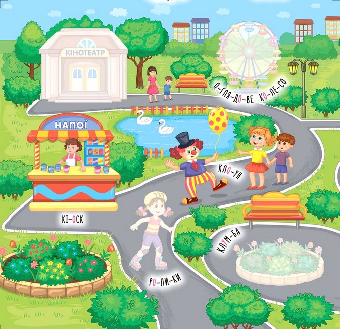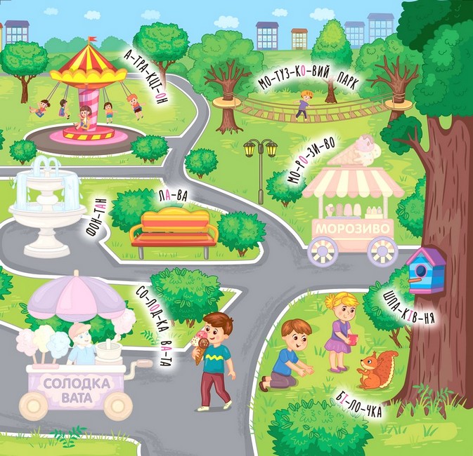 Книга познайомить малюка з навколишнім світом: дитина вирушить на прогулянку містом, відвідає парк та кафе, пограється на дитячому майданчику й побуває на спортивному стадіоні.