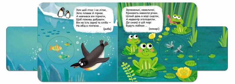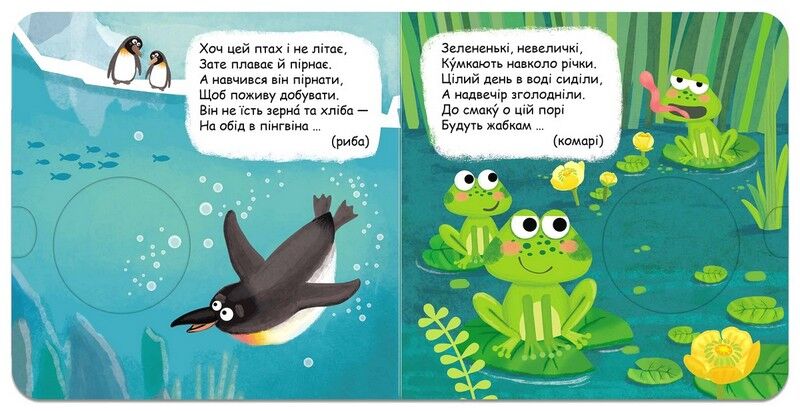 Книжечка розповість малятам про те, чим харчуються дикі та свійські тварини. Тут можна прочитати віршики-загадки про різних звірят, відгадати, про кого йде мова, а потім знайти їхню їжу, висунувши прихований елемент.