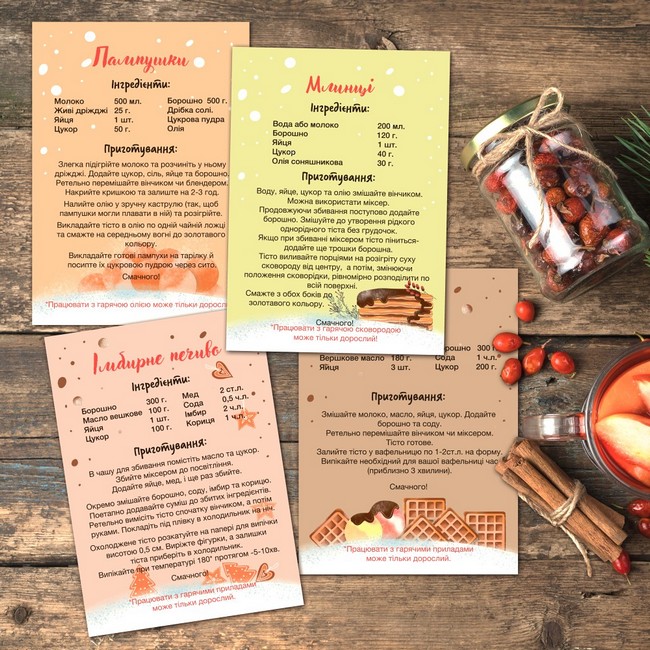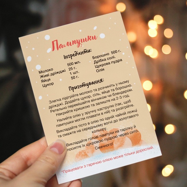Завдання творчі, до кожного з них у наборі є відповідна картка. Це можуть бути тимчасові тату, розмальовка, вітальна листівка, лист до Миколая або смачний рецепт.