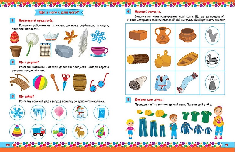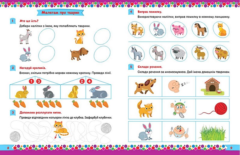 Тематичні сторінки наповнені розвиваючими вправами, які допоможуть дитині навчитися рахувати, складати речення, робити звуковий аналіз слів, логічно мислити, розвивати перші навички письма. А яскраві наліпки додадуть цікавості виконанню.
