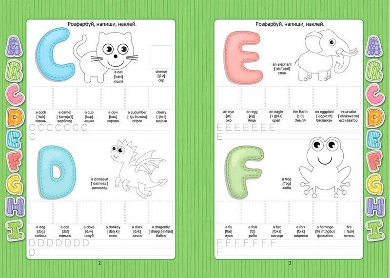 «Англійська абетка» — чудовий помічник для вивчення англійської. Вправи допоможуть вивчити літери англійської абетки, прості слова. Дитина потренується писати друковані літери за пунктиром, а за допомогою яскравих наліпок зможе виконати цікаві завдання. Такі вправи-тренажери ефективно готують руку до письма і дарують задоволення від навчання!