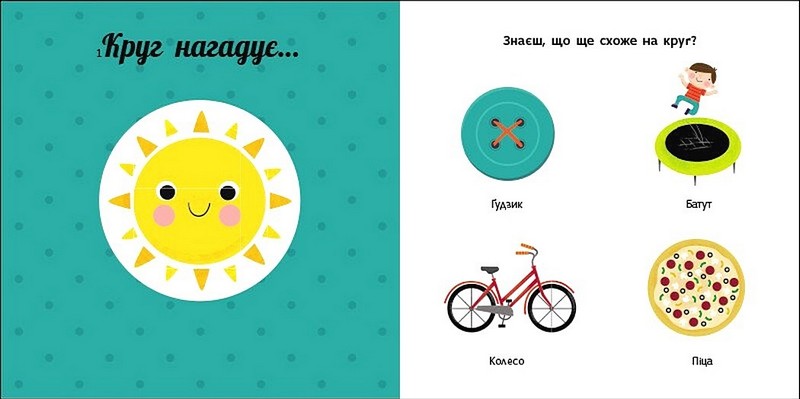 Квадрат, круг, трикутник... Які фігури ти знаєш? Обертай колесо та вивчай шість основних фігур! А на сусідній сторінці тренуйся, розглядаючи милі ілюстрації з предметами певної форми. Нехай навчання буде цікавим і веселим!