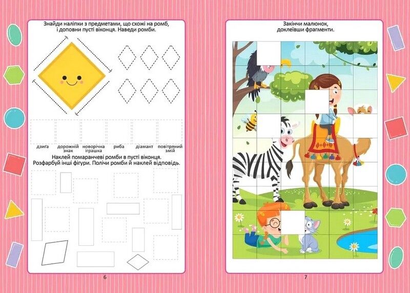 Цікаві вправи познайомлять дитину з простими геометричними фігурами і стануть корисним графічним тренажером. Виконуючи завдання, дитина здобуде необхідні навички письма, лічби, розвине логічне мислення і спостережливість.