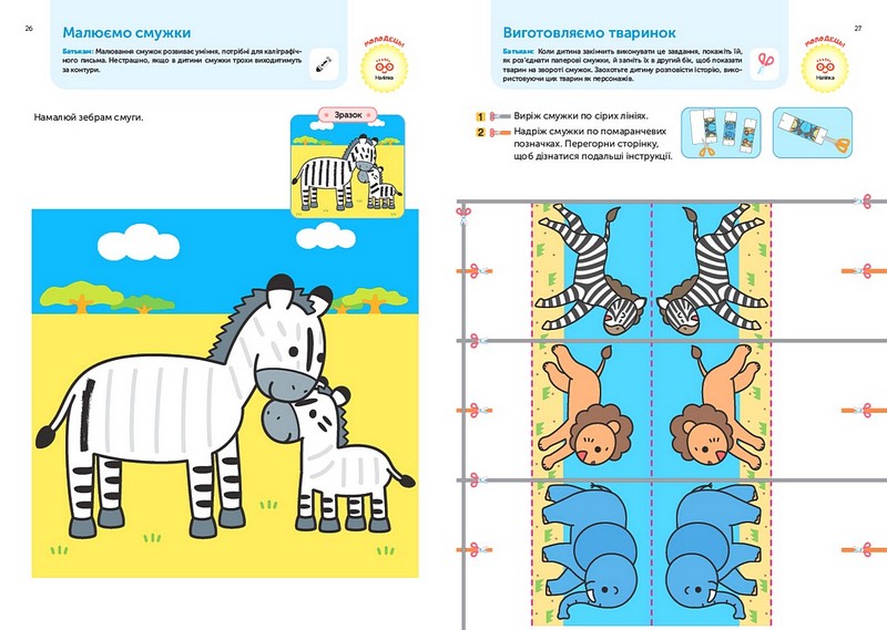 Після того як дитина завершить виконувати завдання, ви можете обговорити предмети, зображені на сторінці: вказати і назвати тварин, предмети, кольори чи форми; порівняти, які з предметів більші, а які менші; порахувати речі на ілюстрації. Кожне завдання старанно розроблене для розвитку конкретної навички. Але, розглядаючи малюнки, дитина також матиме втіху від спілкування з вами.
