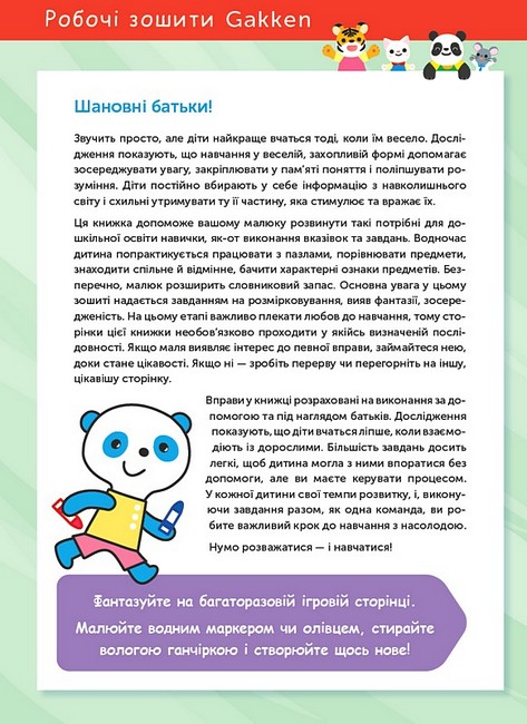Вправи у книжці розраховані на виконання за допомогою та під наглядом батьків. У кожної дитини свої темпи розвитку, і, виконуючи завдання разом, як одна команда, ви робите важливий крок до навчання з насолодою.