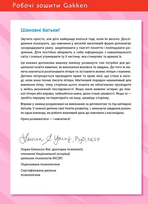 Вправи у книжці розраховані на виконання за допомогою та під наглядом батьків. У кожної дитини свої темпи розвитку, і, виконуючи завдання разом, як одна команда, ви робите важливий крок до навчання з насолодою.