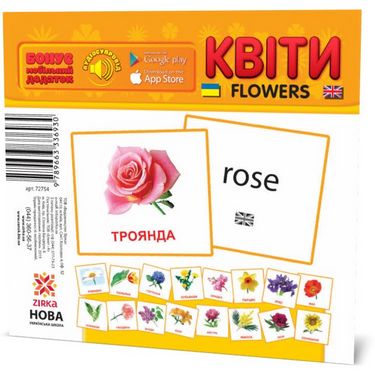Скачай додаток, встанови його на свій пристрій, відкрий програму та введи код, який зазначено на обороті обкладинки (в кожному комплекті свій унікальний код). Ти почуєш, як вимовляються слова - назви зображених на картках об'єктів українською та англійською мовами.