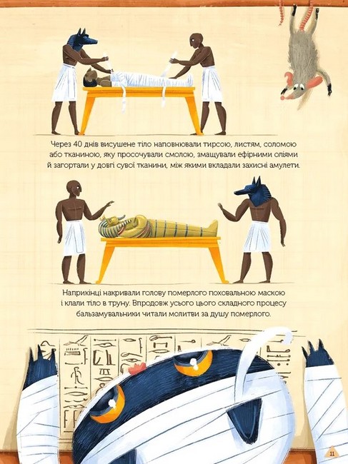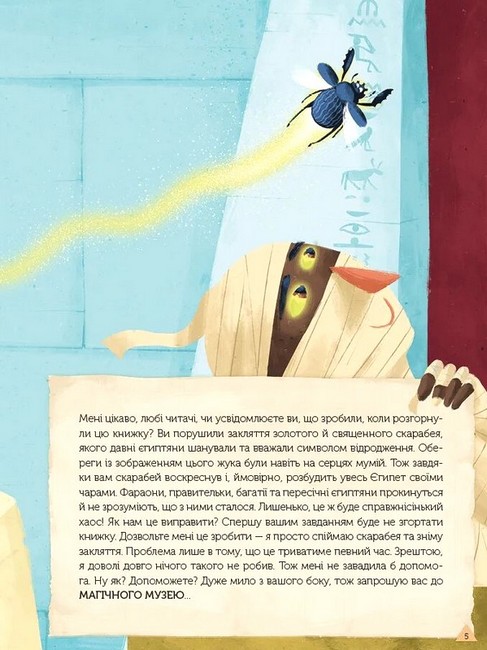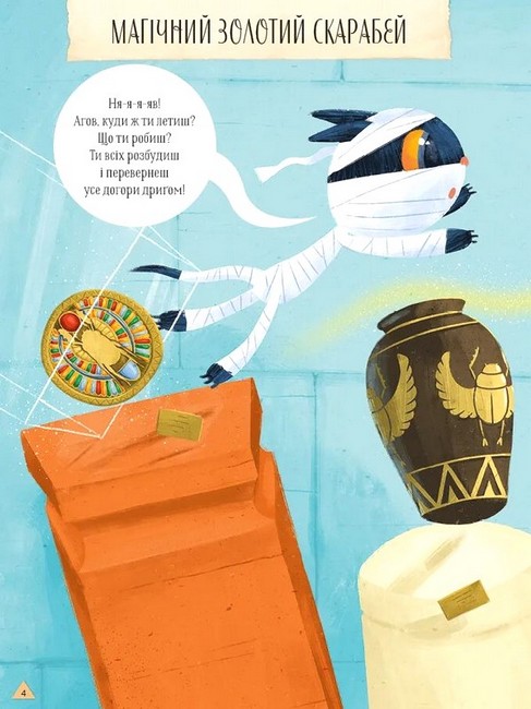 Хтось вважає музеї цікавими, а хтось — нудними. А якщо сповнити музей магії та чарів — це буде вже щось інакше. Якщо не вірите, розгорніть цю книжку — і дещо відбудеться. Закляття священного скарабея подіє: музейні експонати Стародавнього Єгипту оживуть, а з ними котик, який ще пам’ятає Клеопатру. Завдання котика полягає в тому, щоб усе привести до ладу, спіймати скарабея та зняти закляття. Утім, ця справа нелегка. Разом із котиком та сірими помічницями-мишками ви пробіжитеся музеєм навздогін за чарівним скарабеєм. На цьому шляху мимохідь ви дізнаєтеся багато цікавого про неймовірну цивілізацію Стародавнього Єгипту.