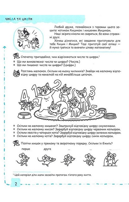 Унікальний за змістом і методичним наповненням робочий зошит — стильний та сучасний, зроблений з любов’ю та знанням своєї справи провідними вітчизняними фахівцями. Зошит має на меті сформувати у дітей шостого-сьомого року життя під час індивідуальних та групових занять необхідну логіко-математичну компетентність — початкові математичні й логічні навички. Посібник містить необхідний теоретичний матеріал, а також сучасні, цікаві, доступні, актуальні завдання, скомпоновані за принципами цілісності, системності, послідовності, поступового ускладнення, закріплення та повторення матеріалу. Зошит укладено за чинним Базовим компонентом дошкільної освіти та програмами розвитку дитини. До завдань із математики та логіки входить матеріал із природознавства, підготовки руки до письма, суспільствознавства, розвитку мовлення тощо. Герої зошита, котик та мишеня, перетворять заняття на веселу й цікаву гру.