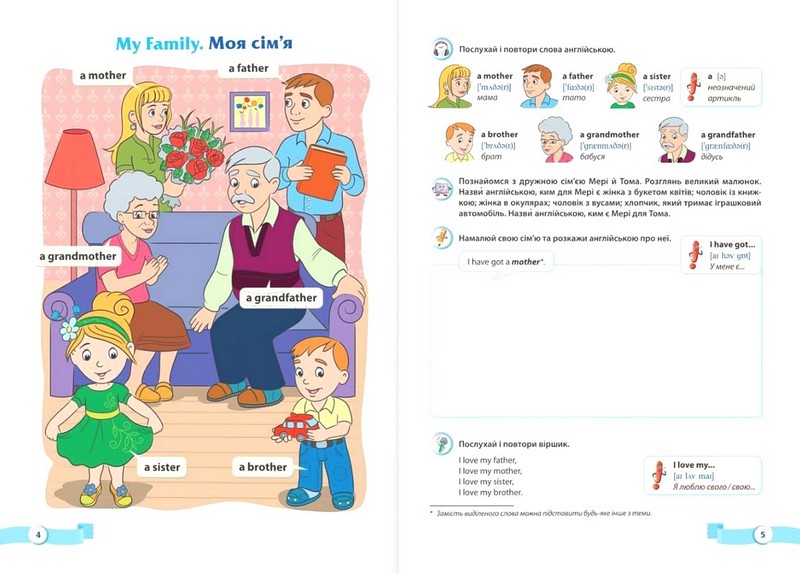 У посібнику подано тематичний ілюстрований словник з комунікативно-орієнтованими вправами. Видання допоможе навчити дітей спілкуватись на початковому рівні.