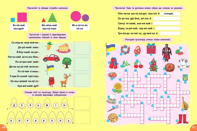 На сторінках книжки «Читання. Словосполучення та речення» дитина буде читати словосполучення і речення по складах; поєднуватиме слова в словосполучення за змістом, позначатиме ознаки вказаних предметів та хибні й істинні твердження, доповнюватиме речення потрібними наліпками й малюнками, розгадуватиме кросворд і ребуси, а також виконає вправи на розуміння прочитаного й повправляється із цікавими ігровими прописами й наліпками. Прості завдання в цікавому оформленні стимулюватимуть до пізнання і вивчення матеріалу, необхідного для дошкільняти.