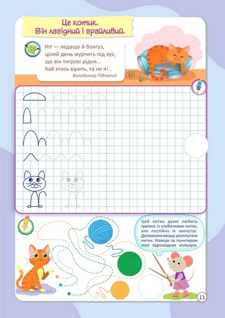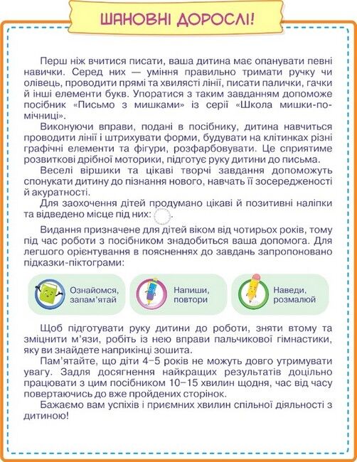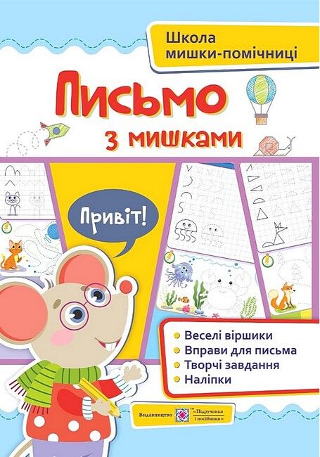 Якщо вашій дитині саме час опановувати навички письма, скористайтеся посібником «Письмо з мишками» із серії «Школа мишки-помічниці». Він містить вправи і завдання, спрямовані на розвиток дрібної моторики, координації рухів руки. Організувавши навчання в ігровій формі, ви навчите дитину правильно тримати ручку чи олівець, проводити прямі та хвилясті лінії, писати палички, гачки та інші елементи букв.
