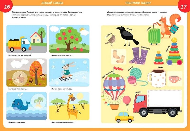 Яскрава, цікава книжка для дошкільнят з розвитку мовлення. Це і перший ілюстрований словничок, з яким дитина легко вивчить нові українські слова; і корисна книжка з наліпками та розмальовками для розвитку дрібної моторики і навичок письма. Вона неодмінно сподобається діткам, які люблять веселі пізнавальні завдання.