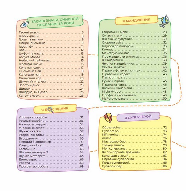 На сторінках розташована не лише цікава інформація, а й безліч різноманітних завдань. Тож, наприклад, дізнавшись про системи кодування, хлопчик одразу ж спробує вигадати таємний шифр, а прочитавши про піратів, створить власну піратську мапу.