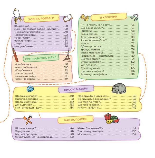Космос, пірати, комікси, бойові мистецтва, штучний інтелект, аніме — ось зовсім не повний перелік тем, які вміщує ця книжка. Разом із нею хлопець досліджуватиме себе та світ навколо, подорожуватиме, відкриватиме таємниці власного тіла, вчитиметься спілкуватися з іншими людьми, створить корисний та смачний раціон харчування та обере хобі собі до душі.