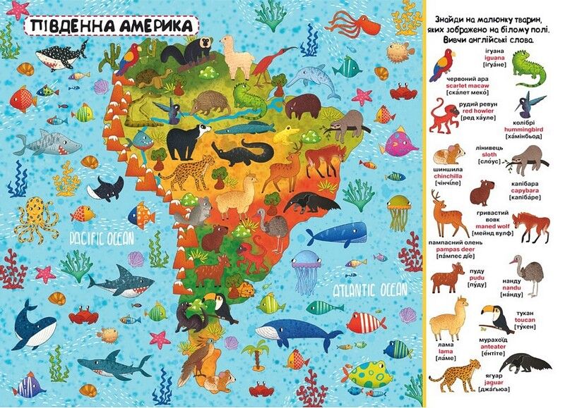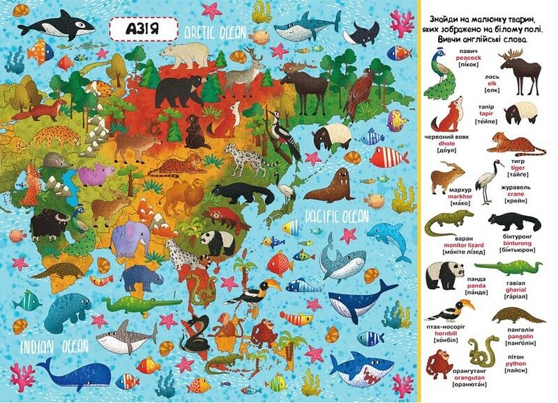 Пропонуємо Вашій дитині вирушити в захоплюючу подорож навколо світу. Разом із нашим віммельбухом малюк побуває в Європі, Азії, Африці, Австралії, Північній і Південній Америці. Він дізнається, які тварини мешкають на кожному з материків і як вони виглядають. У книжці-віммельбусі безліч яскравих і барвистих малюнків, розглядаючи які можна не тільки пізнавати навколишній світ, але й вигадувати власні історії, виконувати цікаві завдання-ігри, вивчати англійські слова.