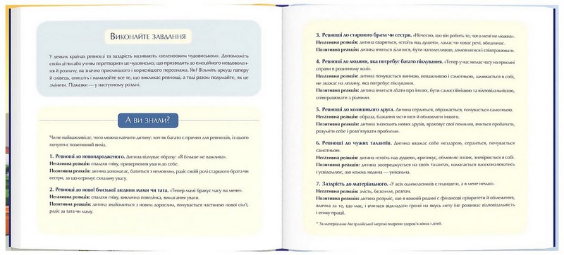 - В кінці книги є практичний розділ для дорослих «Майстерня емоцій» від експертки світового рівня у сфері розвитку емоційного інтелекту. В ньому дбайлвиві дорослі знайдуть арсенал дієвих стратегій поводження з дитячими ревнощами і заздрістю.