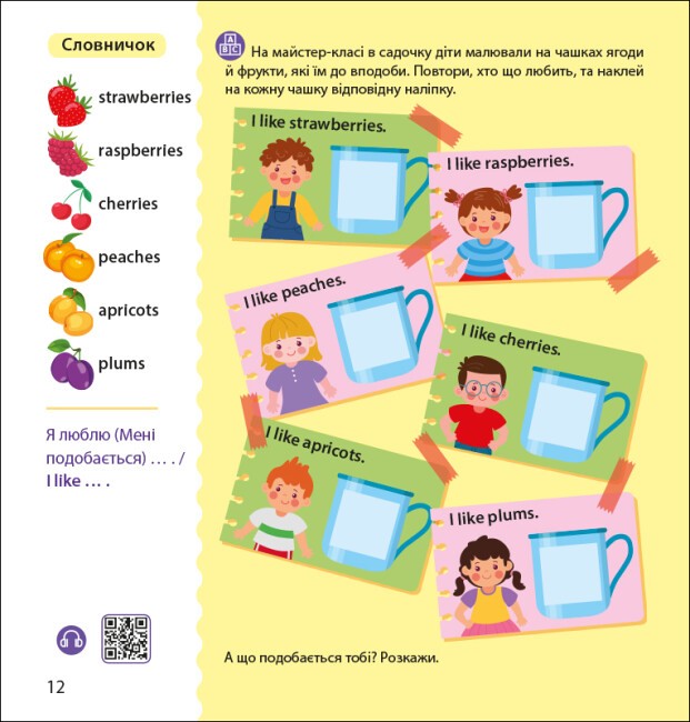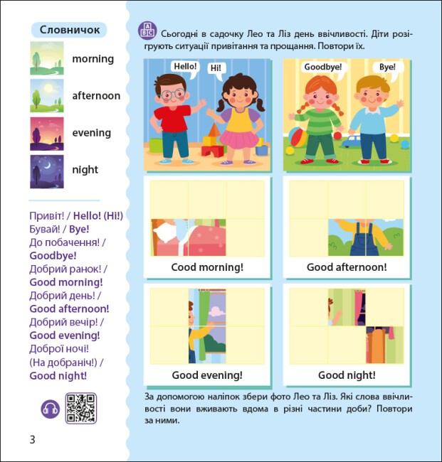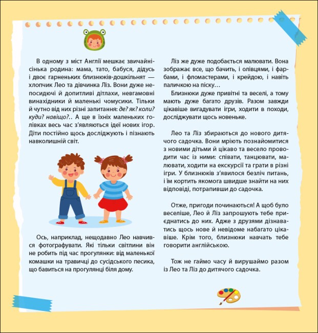 «Англійська з наліпками» — серія для першого знайомства з простою часто вживаною лексикою англійської мови з аудіосупроводом. У зошиті «Лео та Ліз запрошують до садочка», головні герої — веселі близнюки Лео та Ліз, кличуть дитину до свого садочка і навчають спілкуватися англійською. Різноманітні ігрові завдання, які тісно пов’язані з життям дітей, спонукають дошкільника до активного вживання англійської лексики. Книга містить також прості поради для батьків. Корисно для дітей 4-6 років.