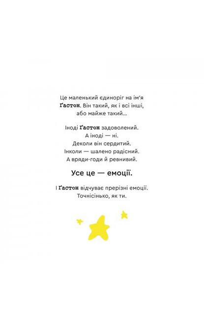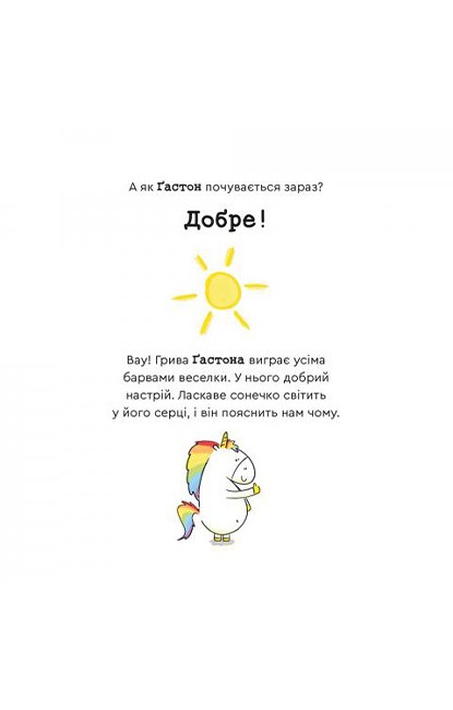 Радість – одна з найважливіших емоцій у житті дитини. Вона вчить бути вдячним, помічати прекрасне довкола та ділитися добром. Єдиноріжок Ґастон у цій історії показує малюкам, як можна радіти простим речам і передавати свій настрій іншим. Усередині книжки є вправа, що допоможе дитині краще проживати і виражати позитивні емоції.