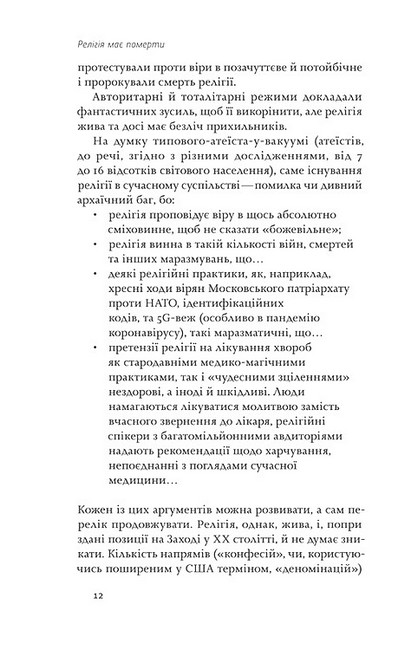 У книжці «Релігія має померти, або У кого ми повіримо після Бога» релігієзнавець В’ячеслав Агеєв пояснює, як релігії функціонують та як заробляють гроші, борються за владу, використовують психоактивні речовини і секс та як реагують на нові виклики, — від ЛГБТ та економічних катастроф до воєн і Сovid-19. Чому комунізм, попри найжорстокіші репресії, так і не зміг знищити релігію? Як щупальця конспірології проникають у людську свідомість і чому критичне мислення вимикається, коли йдеться про теорії змови чи про бойових комарів НАТО та рептилоїдів?