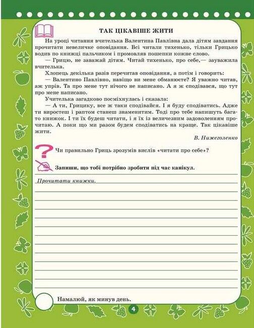 Матеріал посібника відповідає чинній програмі початкової школи. Цікаві тексти для читання, завдання для повторення лічби, тренування уваги, самоконтролю, майстрування, кулінарії допоможуть підтримати й розвинути не тільки загально-навчальні навички, але й увагу, пам'ять, мислення дітей, допоможуть їм зустріти наступний навчальний рік, не втративши набуті протягом попереднього навчального року знання.
