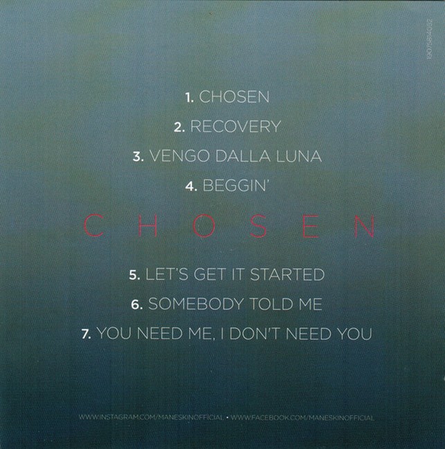 Chosen is the debut extended play by Italian rock band Maneskin. It was released on 8 December 2017 and peaked at number 3 on the Italian Albums Chart. The EP includes the single with the same name and another original song ("Recovery"), both in English, and various cover songs performed during the eleventh season of X Factor Italia. The EP was certified platinum and in addition its tracks collected two platinum and four gold certifications by FIMI.