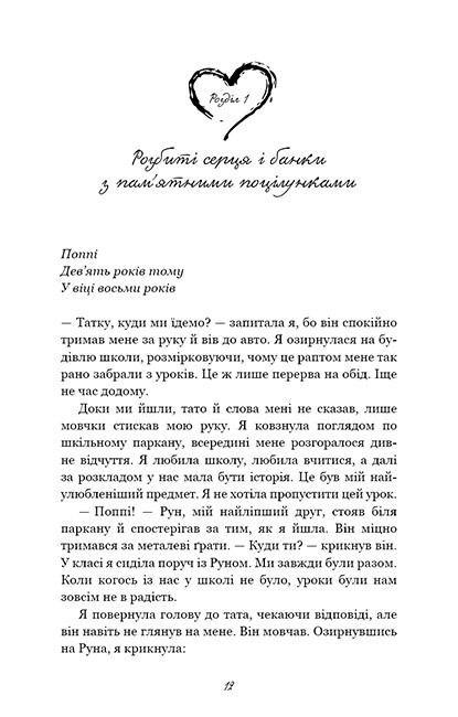 Чи може кохання тривати вічно, попри перешкоди, відстань і час? Це можливо, якщо поєднуються дві половинки одного серця. Руну п’ять, він із батьками щойно переїхав із рідної Норвегії до маленького містечка американського штату Джорджія і дуже засмучений через це. Та відколи він знайомиться з дивакуватою сусідкою Поппі, його життя набуває яскравих кольорів і перетворюється на справжню пригоду. Поппі, виконуючи заповіт улюбленої бабусі, має на меті зібрати тисячу поцілунків, але не звичайних, а особливих, таких, коли серце мало не вистрибуватиме з грудей. Саме такі поцілунки обіцяє їй подарувати Рун. Історія кохання, яка розіб’є вам серце.