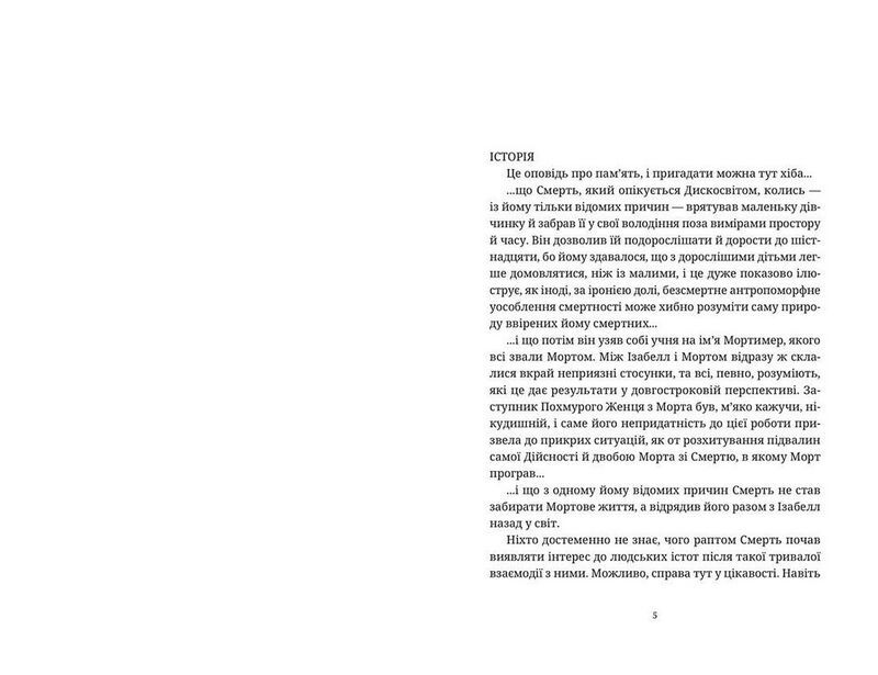 Коли тобі шістнадцять, тебе звуть Сюзен і найбільше твоє досягнення — це вміння бути непомітною — звістка про те, що насправді ти внучка... Смерті, буде наче грім серед ясного неба. А тепер ще й твій дід вирушив кудись на пошуки внутрішнього спокою, і за його справу потрібно взятися тобі. Кінь і коса додаються в комплекті до завдання.