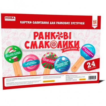 Ранкові смаколики. Картки-запитання для ранкових зустрічей НУШ «Ранкові смаколики» - це картки-запитання для ранкових зустрічей. Комплект містить 24 цукерки-запитання для гарного початку дня, позитивного настрою, пізнання себе та інших, навколишнього світу, формування дружніх відносин і розуміння різноманітності й різнобарвності життя! Питання на картках – практичні, покликані розвивати фантазію, уяву, мовлення, увагу, розуміння свого емоційного стану і вміння його виразити словами, – а це прямий шлях до формування психічно зрілої особистості, здатної протидіяти булінгу та випробуванням. Рекомендовано як для застосування та навчання в групах дітей у дошкільних та загальноосвітніх навчальних закладах, так і для розвитку емоційного інтелекту дитини вдома. Картки виготовлені з картону.