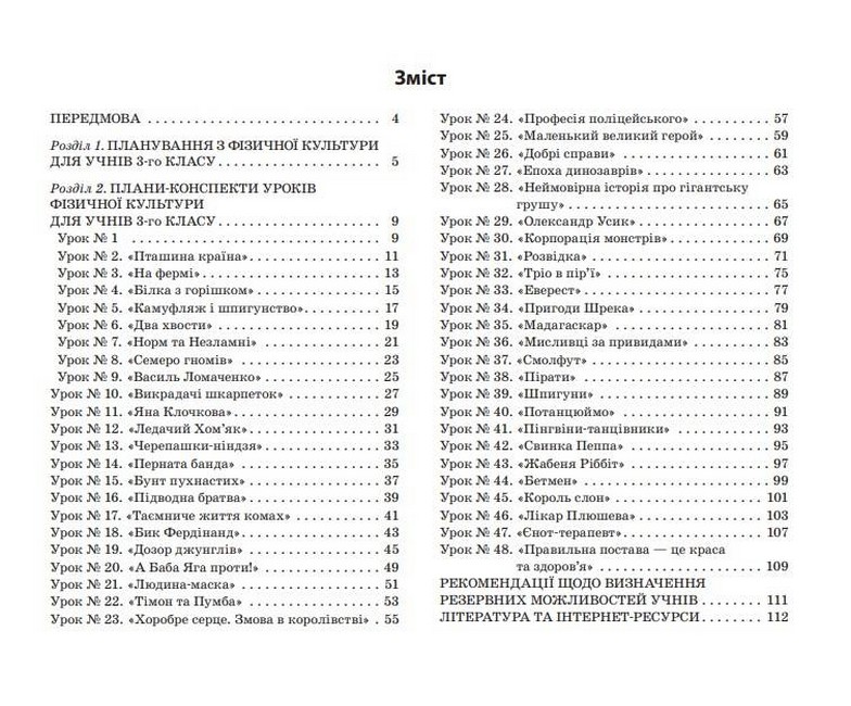 Включає в себе: 48 розкритих планів-конспектів уроків з фізичної культури у 3-му класі на І семестр; орієнтовне календарне та тематичне планування; рекомендації щодо визначення резервних можливостей учнів. Уроки побудовані за цікавими сюжетними лініями та мотивами сучасних мультфільмів, героїв, що подобаються дітям.