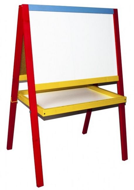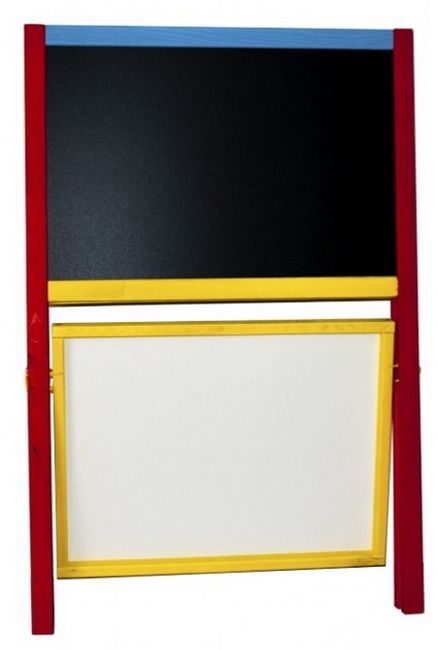 Мольберт дитячий дерев'яний "Класика". Одна поверхня чорна для малювання крейдою, інша - біла магнітна (полімерне покриття) для малювання кольоровими сухостираємими або водними маркерами. Під поверхнями поличка для крейди і фломастерів.