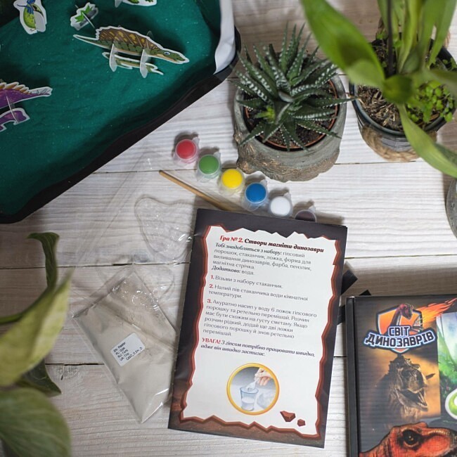Динозаври – це неймовірні тварини, які заселяли нашу планету сотні мільйонів років тому. Це найдивовижніші істоти, які коли-небудь жили на нашій планеті. На превеликий жаль, вони всі вимерли. Але ти маєш змогу трішки відтворити минуле! Створи власний світ динозаврів за допомогою гіпсового порошку та спеціальної форми. Розфарбуй готові фігурки і прикрась ними холодильник.