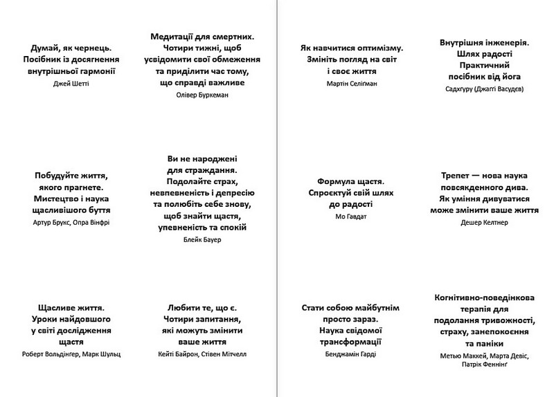 У збірнику «Тренажер оптимізму» ми зібрали самарі 12 світових бестселерів, завдяки яким ви навчитеся: