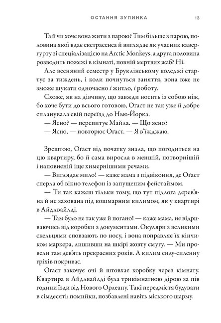 Кейсі Макквістон відома завдяки світовому бестселеру "Червоний, білий та королівський синій", і "Остання зупинка" підтверджує її талант. Це історія про силу випадковості, магію моменту й те, як одне знайомство може змінити цілий світ. Тут є щирий гумор, теплі діалоги та персонажі, яких хочеться знати особисто. Книга закохує у себе з перших сторінок.