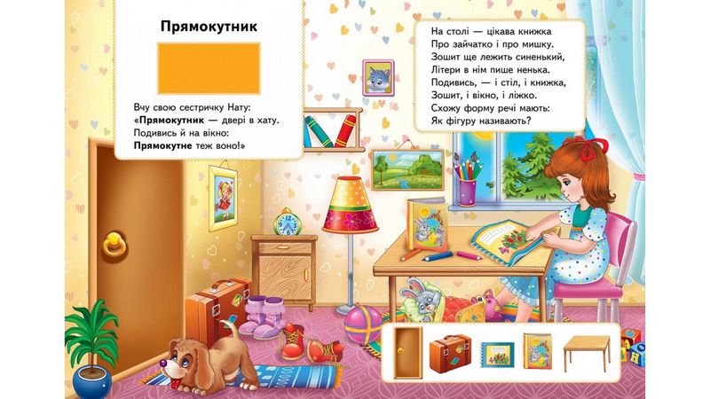Вісь двері-прямокутник і печиво-квадрат, колесо-коло і дах-трикутник. З ними дитина познайоміться, слухаючи вірші нашої яскравої картонної книжечки. З нею можна працювати за таким алгоритмом: