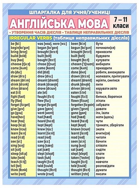 Шпаргалка з англійської мови для учнів 7-11 класів! Легкий і зручний формат книжечки (10,3х13,9 см) — ідеальний супутник для навчання. Двостороння шпаргалка у вигляді гармошки з 5 перфораціями зручно вміщується в кишені.