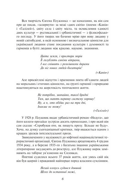 Євген Плужник — винятковий і неповторний поет-імпресіоніст і прозаїк. Його твори сповнені ідеєю гуманізму, а своїми особистими ви тонченими враженнями та спостереженнями за мінливими людськими відчуттями і переживаннями він прагнув поділитися з читачем і вплинути на його світогляд.