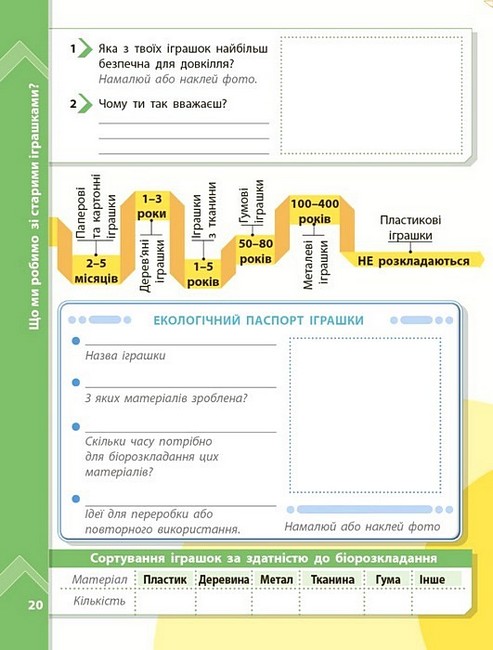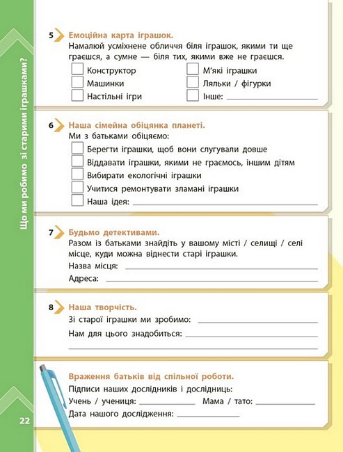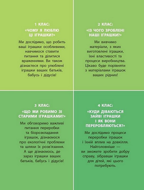 Зошит структурований за роками навчання: від пізнання іграшок та їхніх особливостей у 1 класі до вивчення матеріалів у 2 класі, екологічних аспектів у 3 класі та соціальної відповідальності в 4 класі. Проєкт створений командою STEM-старт & Harmony з метою заохочення сімейної співпраці, розвитку наукового мислення та виховання екологічної свідомості у дітей.