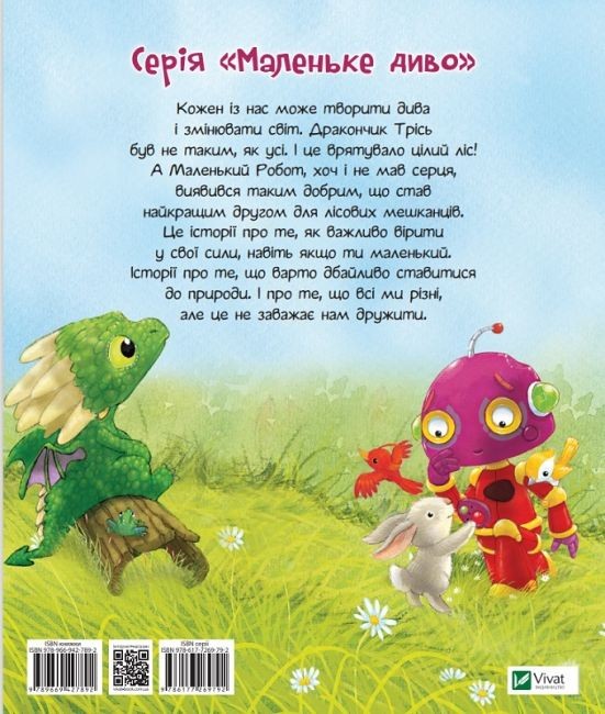 Кожен із нас може творити дива і змінювати світ. Дракончик Трісь був не таким, як усі. І це врятувало цілий ліс! А Маленький Робот, хоч і не мав серця, виявився таким добрим, що став найкращим другом для лісових мешканців. Це історії про те, як важливо вірити у свої сили, навіть якщо ти маленький. Історії про те, що варто дбайливо ставитися до природи. І про те, що всі ми різні, але це не заважає нам дружити.