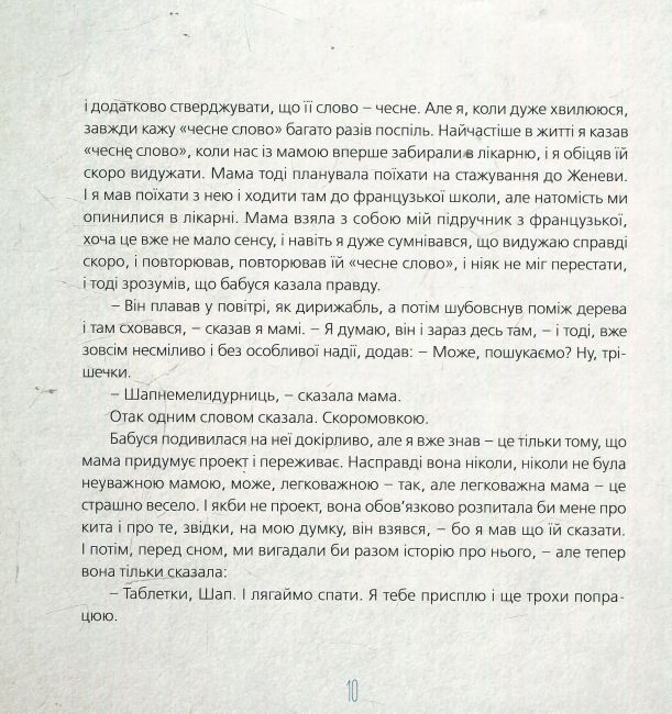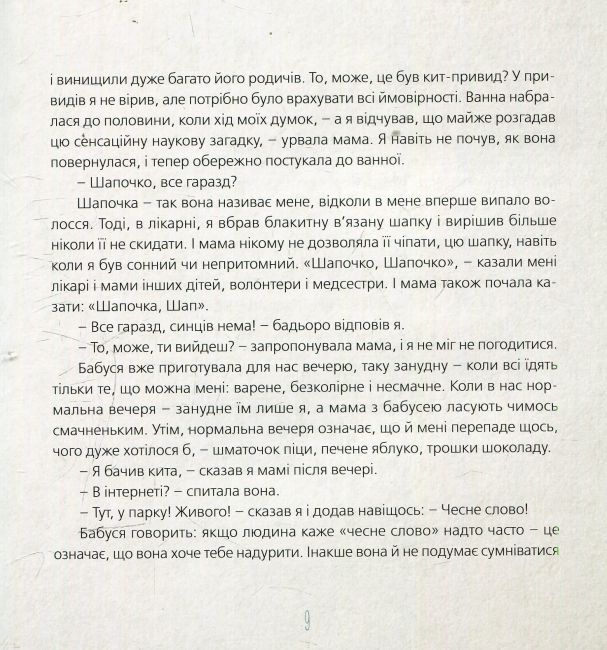 У житті Шапочці багато чого наразі не можна – їсти всілякі ласощі, бігати, кататися на лонгборді і навіть гладити собак. А ще потрібно вчасно приймати таблетки, адже Шап (а так хлопчика звуть відтоді, як у нього після хіміотерапії випало волосся і він не хотів скидати блакитну у язану шапку) досі бореться з лейкозом. Однак хлопчик не впадає у відчай, а спілкується зі своїм новим другом – блакитно-сірим китом, який невідь-звідки узявся в повітрі над містом. Кіт навіть може катати Шапа на спині понад хмарами...