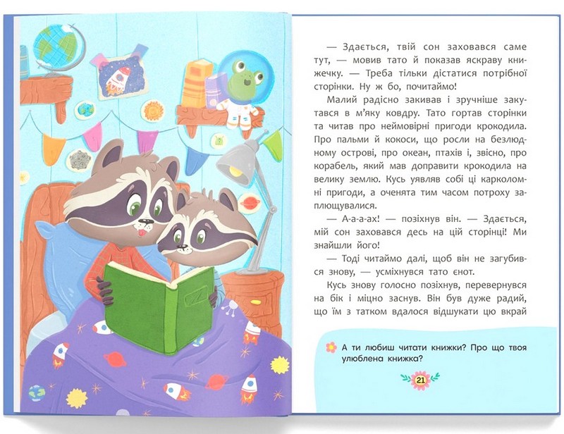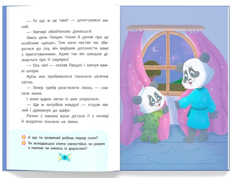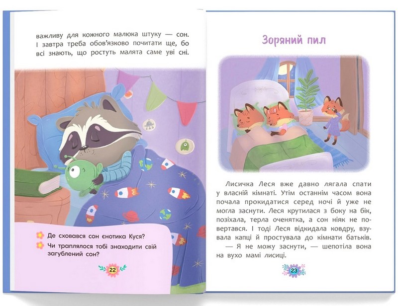«Казочки для солодких снів» створено спеціально для читання перед сном. Малюк дізнається, як панденятко навчилося не вертітися в ліжку й почало легко засинати; де ховається загублений сон і як єнотик його шукав; як збирати зоряний пил і як він допоміг лисичці міцно спати вночі у власному ліжечку. Казки з чарівними ілюстраціями та затишними історіями допоможуть малюку розслабитися та зануритися в міцний сон.