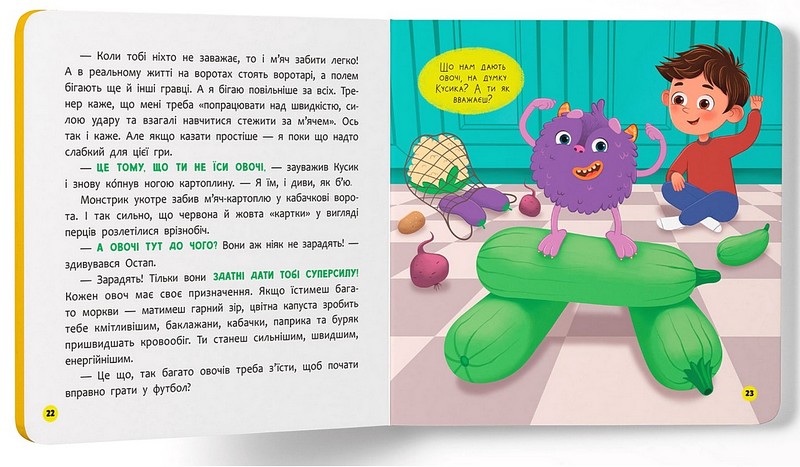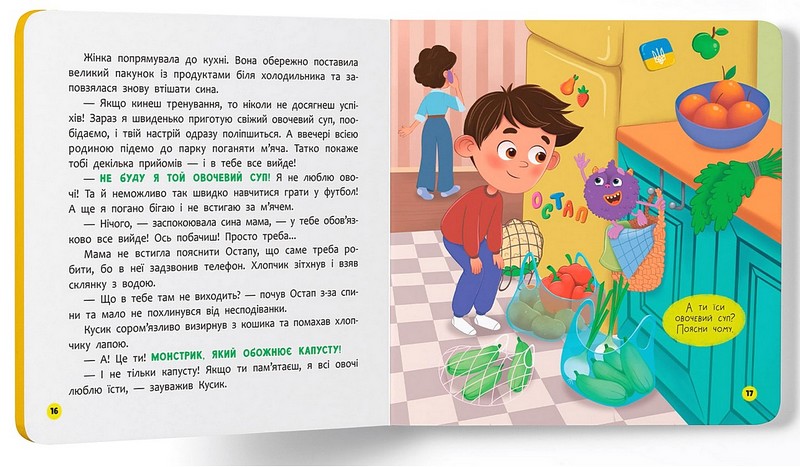 Кусик — кумедний монстрик, який просто в захваті від овочів! Морква, зелень, огірки, салат, а особливо капуста — для нього найкращі у світі ласощі. Кусик мешкає в коморі квартири хлопчика Остапа, який і чути не хоче про овочі, особливо сирі. Але раптова зустріч із Кусиком відкриває хлопчику дивовижний секрет: овочі — це джерело суперсили, вітамінів та енергії. А ще вони смачні та соковиті, а деякі навіть солодші за печиво. Разом з новим другом Остап наважується скуштувати капусту в борщі, потроху змінює своє ставлення до овочів, а згодом і взагалі стає справжнім овочелюбом. Ця книжка — про дружбу, нові відкриття і те, як корисна їжа може робити нас сильнішими та здоровішими!
