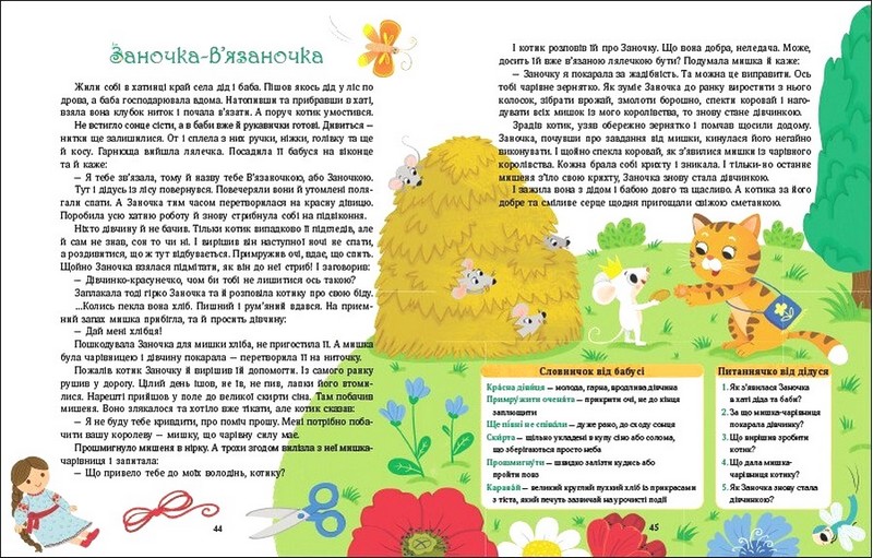 До цієї збірки казок дібрані не надто поширені і відомі українські народні казки, що робить її особливо цінною. Казочки невеликі за обсягом, мають цікаві сюжети та навчають дитину життєвим цінностям, передаючи мудрість поколінь. Чи здатні малі створіння протистояти великим і дужим? Як кмітливість може урятувати життя? Чому голодна воля ліпше, ніж сита неволя? Ці та інші важливі питання знаходять відповіді в текстах народних казок. Для того щоб дитина краще зрозуміла зміст казок, збагатила своє мовлення і словниковий запас, кожна історія містить «Словничок від бабусі» та «Питаннячко від дідуся». Ця збірка є справжній словоскарб! Яскраві ілюстрації Юлії Мітченко доповнюють історії, збагачуючи їхню образність та створюючи особливий настрій.