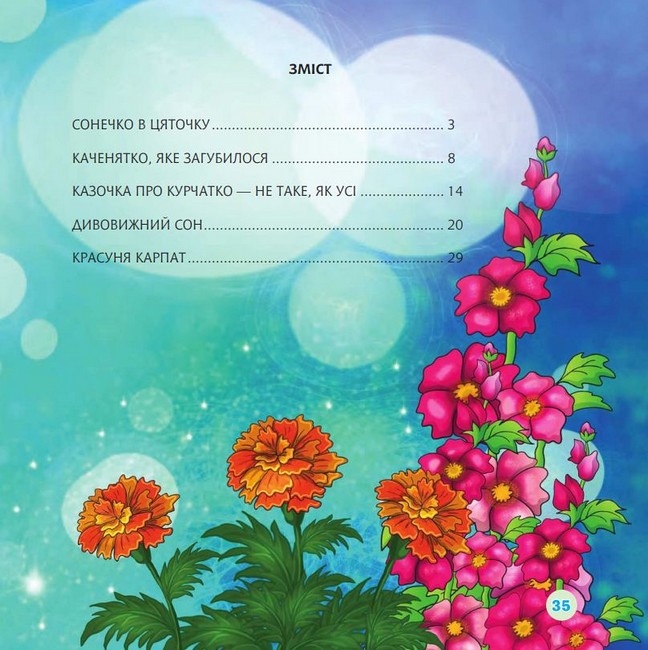 Цікаві й зворушливі казочки з дивовижними пригодами нікого не залишать байдужими. Вони зачарують вигаданим світом, у якому живуть допитливі курчатка й каченятка, прудка ящірка й комашка Сонечко, сміливий хлопчик Олексійко, а також закохана в Карпати гуцулочка Аріяна. У книжці багато несподіванок, приємних відкриттів, захопливих історій.