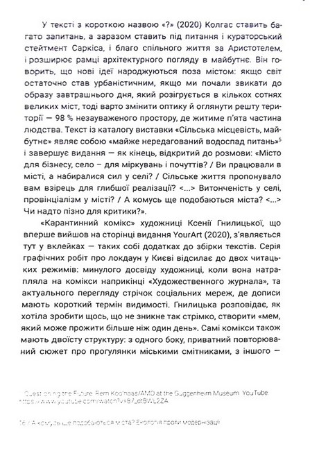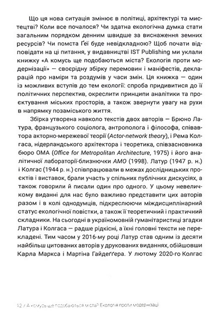 Упорядник збірки та головний редактор ist, Борис Філоненко розповідає, чому під сьомим номером книжка з серії Small Run Books виходить саме на таку тему: «Брюно Латур і Рем Колгас під однією обкладинкою. Думаю, тим, хто не зміг потрапити на їхні спільні дискусії та проєкти, буде цікаво прочитати ці тексти разом, після виставки Колгаса Countryside. The Future в Музеї Ґуґґенгайма та бієнале в Тайбеї You and I Don’t Live on the Same Planet, співкуратором якої був Латур. Для мене "А комусь ще подобаються міста? Екологія проти модернізації" — це передусім збірка з багатьма авторами та авторками, яка дає орієнтири та має потенціал продовжити спільне обговорення нагальних питань сьогодення. Хмарка тегів: екологія, руїни капіталізму, апокаліпсис, зелені партії, рухлива архітектура, пандемія, сільська місцевість замість міста.