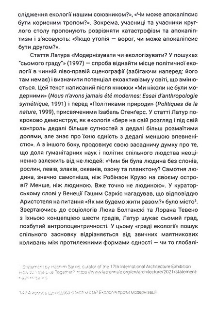 У збірці про екологію, політику та архітектуру французький соціолог, антрополог і філософ Брюно Латур і нідерландський архітектор і теоретик Рем Колгас говорять про те, як прийняти апокаліпсис за нагальний стан сьогодення й заразом далі спрямовувати питання в майбутнє. Де пролягає розрив між теорією та практикою політичної екології? Чи можливі «вищі цінності» та форми надлюдського співіснування? Наскільки рухливими є будівлі? Які запитання ставить архітектор, щоб привести нас за місто? Чому майбутнє чекає на нас у сільській місцевості? Автори й авторки збірки говорять про це за круглим столом, у статтях, есеях і коміксах.