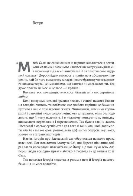 • Книжка розповідає про власність з кількох різних точок зору: економічної, соціальної, політичної, культурної, юридичної, психологічної. Тому читати її досить цікаво, щоб отримати повну картину уявлень про поняття власності.