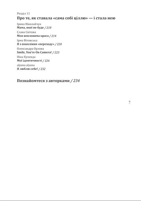 Головна мета цієї книжки — аби по той бік сторінок почули. Аби жінки, які з дня на день носять у собі свої мовчазні історії, розуміли, що вони не одні. Аби ті, хто хоче здатися, не здавалися. У цій книжці зібрані історії про тілесність, сексуальність, біль, пошуки ідентичності, материнство, досвід важкої хвороби, токсичні стосунки та зцілення. Це книжка-розрада, книжка-виклик, книжка-посестра.
