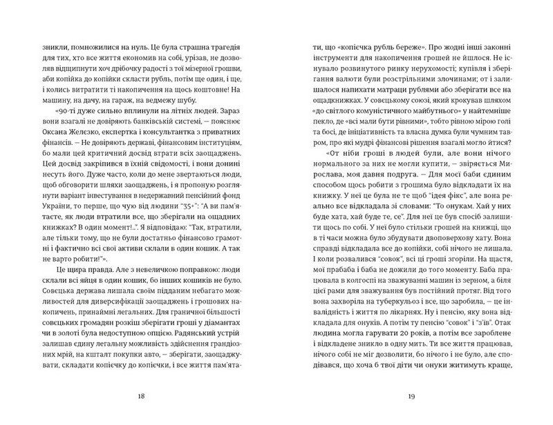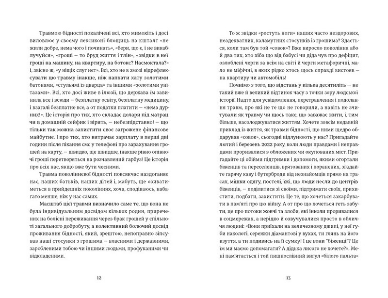 Книжка «Твоє, моє, нічиє та інше» — це коротка історія наших <совкових> травм крізь призму жіночого погляду. Тут ідеться про подолання колективного <совєцього октябрьонка>, який навіть через три десятиліття після розпаду срср досі передається у спадок новим генераціям українців. І передається не лише народженим за часів існування совєцього диктату, не лише тим, хто дорослішав і набував життєвого досвіду в часи з викривленою мораллю та етикою, а й тим, хто народився вже у незалежній Україні, проте виховувався в лекалах і наративах совєцьких візій, традицій та взаємин.